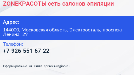 ZONEКРАСОТЫ, сеть салонов эпиляции по адресу 144000, Московская область, Электросталь, проспект Ленина, 29 в дальнейшем Организация, размещена в следующих категориях: