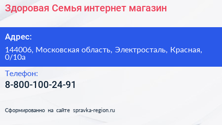 Здоровая Семья, интернет-магазин по адресу 144006, Московская область, Электросталь, Красная, 0/10а в дальнейшем Организация, размещена в следующих категориях:
