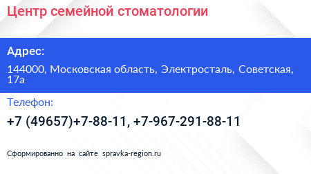 Центр семейной стоматологии по адресу 144000, Московская область, Электросталь, Советская, 17а в дальнейшем Организация, размещена в следующих категориях: