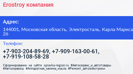 Erostroy, компания по адресу 144001, Московская область, Электросталь, Карла Маркса, 26 в дальнейшем Организация, размещена в следующих категориях: