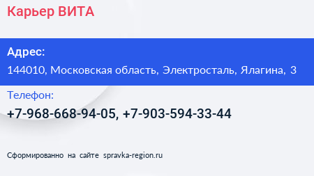 Карьер ВИТА по адресу 144010, Московская область, Электросталь, Ялагина, 3 в дальнейшем Организация, размещена в следующих категориях: