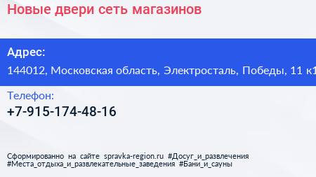 Новые двери, сеть магазинов по адресу 144012, Московская область, Электросталь, Победы, 11 к1 в дальнейшем Организация, размещена в следующих категориях: