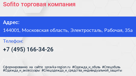 Sofito, торговая компания по адресу 144001, Московская область, Электросталь, Рабочая, 35а в дальнейшем Организация, размещена в следующих категориях: