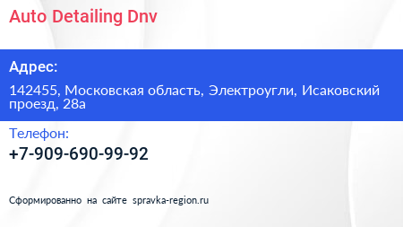Auto. Detailing. Dnv по адресу 142455, Московская область, Электроугли, Исаковский проезд, 28а в дальнейшем Организация, размещена в следующих категориях: