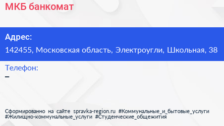 МКБ, банкомат по адресу 142455, Московская область, Электроугли, Школьная, 38 в дальнейшем Организация, размещена в следующих категориях: