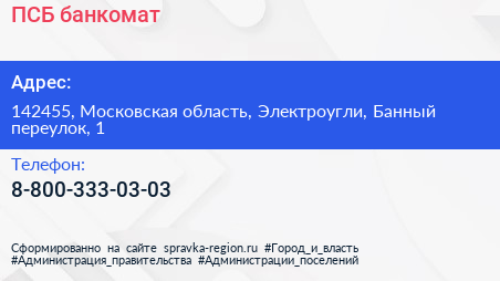 ПСБ, банкомат по адресу 142455, Московская область, Электроугли, Банный переулок, 1 в дальнейшем Организация, размещена в следующих категориях: