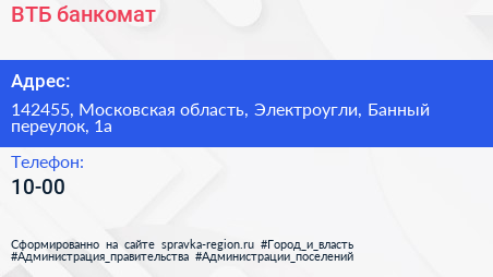 ВТБ, банкомат по адресу 142455, Московская область, Электроугли, Банный переулок, 1а в дальнейшем Организация, размещена в следующих категориях: