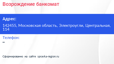 Возрождение, банкомат по адресу 142455, Московская область, Электроугли, Центральная, 114 в дальнейшем Организация, размещена в следующих категориях: