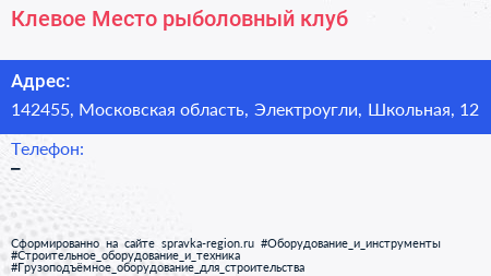 Клевое Место, рыболовный клуб по адресу 142455, Московская область, Электроугли, Школьная, 12 в дальнейшем Организация, размещена в следующих категориях: