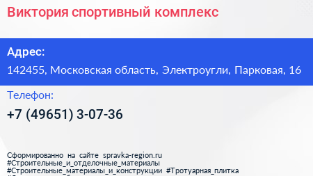 Виктория, спортивный комплекс по адресу 142455, Московская область, Электроугли, Парковая, 16 в дальнейшем Организация, размещена в следующих категориях: