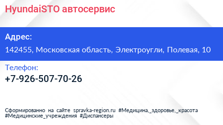 HyundaiSTO, автосервис по адресу 142455, Московская область, Электроугли, Полевая, 10 в дальнейшем Организация, размещена в следующих категориях:
