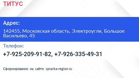 ТИТУС по адресу 142455, Московская область, Электроугли, Большое Васильево, 45 в дальнейшем Организация, размещена в следующих категориях: