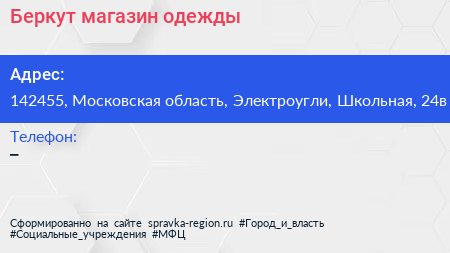 Беркут, магазин одежды по адресу 142455, Московская область, Электроугли, Школьная, 24в в дальнейшем Организация, размещена в следующих категориях: