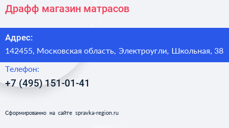 Драфф, магазин матрасов по адресу 142455, Московская область, Электроугли, Школьная, 38 в дальнейшем Организация, размещена в следующих категориях: