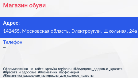 Магазин обуви по адресу 142455, Московская область, Электроугли, Школьная, 24а в дальнейшем Организация, размещена в следующих категориях: