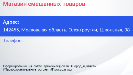 Магазин смешанных товаров по адресу 142455, Московская область, Электроугли, Школьная, 38 в дальнейшем Организация, размещена в следующих категориях: