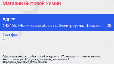 Магазин бытовой химии по адресу 142455, Московская область, Электроугли, Школьная, 38 в дальнейшем Организация, размещена в следующих категориях: