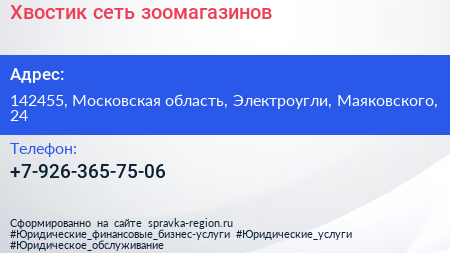 Хвостик, сеть зоомагазинов по адресу 142455, Московская область, Электроугли, Маяковского, 24 в дальнейшем Организация, размещена в следующих категориях: