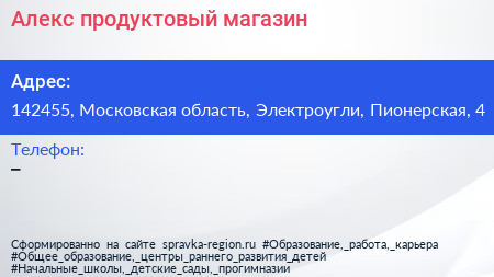 Алекс, продуктовый магазин по адресу 142455, Московская область, Электроугли, Пионерская, 4 в дальнейшем Организация, размещена в следующих категориях: