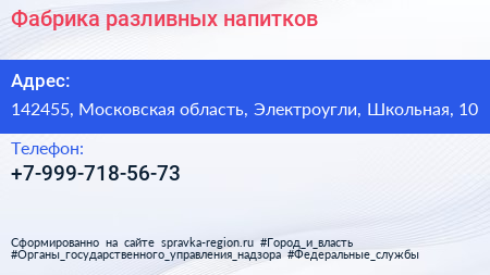 Фабрика разливных напитков по адресу 142455, Московская область, Электроугли, Школьная, 10 в дальнейшем Организация, размещена в следующих категориях: