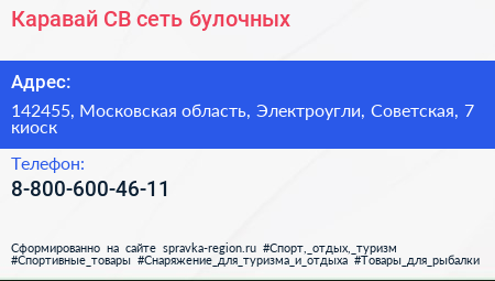 Каравай СВ, сеть булочных по адресу 142455, Московская область, Электроугли, Советская, 7 киоск в дальнейшем Организация, размещена в следующих категориях: