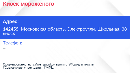 Киоск мороженого по адресу 142455, Московская область, Электроугли, Школьная, 38 киоск в дальнейшем Организация, размещена в следующих категориях: