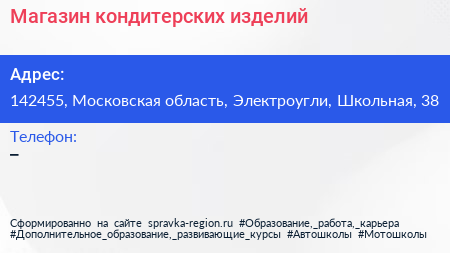 Магазин кондитерских изделий по адресу 142455, Московская область, Электроугли, Школьная, 38 в дальнейшем Организация, размещена в следующих категориях: