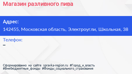 Магазин разливного пива по адресу 142455, Московская область, Электроугли, Школьная, 38 в дальнейшем Организация, размещена в следующих категориях: