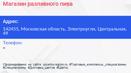 Магазин разливного пива по адресу 142455, Московская область, Электроугли, Центральная, 49 в дальнейшем Организация, размещена в следующих категориях:
