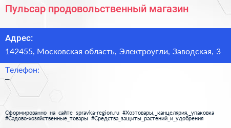 Пульсар, продовольственный магазин по адресу 142455, Московская область, Электроугли, Заводская, 3 в дальнейшем Организация, размещена в следующих категориях: