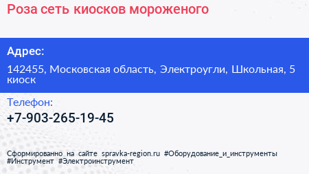 Роза, сеть киосков мороженого по адресу 142455, Московская область, Электроугли, Школьная, 5 киоск в дальнейшем Организация, размещена в следующих категориях: