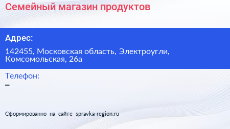 Семейный, магазин продуктов по адресу 142455, Московская область, Электроугли, Комсомольская, 26а в дальнейшем Организация, размещена в следующих категориях: