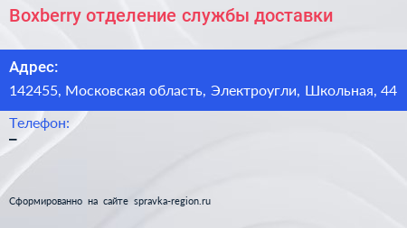 Boxberry, отделение службы доставки по адресу 142455, Московская область, Электроугли, Школьная, 44 в дальнейшем Организация, размещена в следующих категориях: