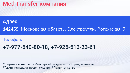 Med-Transfer, компания по адресу 142455, Московская область, Электроугли, Рогожская, 7 в дальнейшем Организация, размещена в следующих категориях: