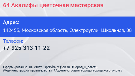 64 Акалифы, цветочная мастерская по адресу 142455, Московская область, Электроугли, Школьная, 38 в дальнейшем Организация, размещена в следующих категориях:
