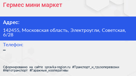 Гермес, мини-маркет по адресу 142455, Московская область, Электроугли, Советская, 6/28 в дальнейшем Организация, размещена в следующих категориях: