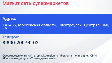 Магнит, сеть супермаркетов по адресу 142455, Московская область, Электроугли, Центральная, 49 в дальнейшем Организация, размещена в следующих категориях: