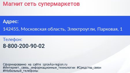 Магнит, сеть супермаркетов по адресу 142455, Московская область, Электроугли, Парковая, 1 в дальнейшем Организация, размещена в следующих категориях: