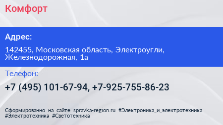 Комфорт+ по адресу 142455, Московская область, Электроугли, Железнодорожная, 1а в дальнейшем Организация, размещена в следующих категориях: