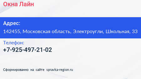 Окна Лайн по адресу 142455, Московская область, Электроугли, Школьная, 33 в дальнейшем Организация, размещена в следующих категориях: