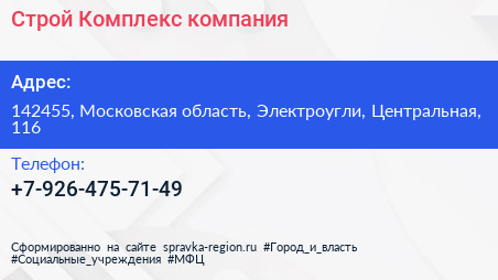 Строй Комплекс, компания по адресу 142455, Московская область, Электроугли, Центральная, 116 в дальнейшем Организация, размещена в следующих категориях: