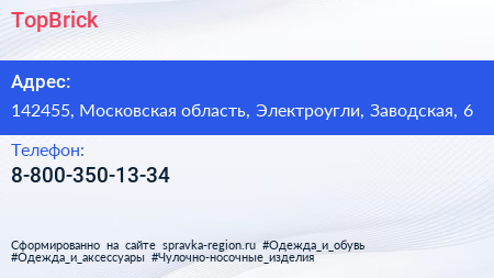 TopBrick по адресу 142455, Московская область, Электроугли, Заводская, 6 в дальнейшем Организация, размещена в следующих категориях: