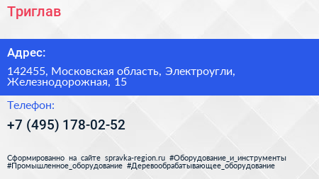 Триглав по адресу 142455, Московская область, Электроугли, Железнодорожная, 15 в дальнейшем Организация, размещена в следующих категориях: