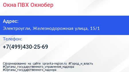 Окна ПВХ Окнобер по адресу Электроугли, Железнодорожная улица, 15/1 в дальнейшем Организация, размещена в следующих категориях: