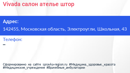 Vivada, салон-ателье штор по адресу 142455, Московская область, Электроугли, Школьная, 43 в дальнейшем Организация, размещена в следующих категориях: