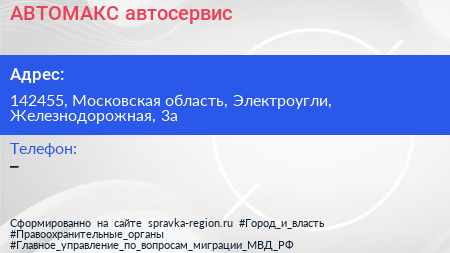 АВТОМАКС, автосервис по адресу 142455, Московская область, Электроугли, Железнодорожная, 3а в дальнейшем Организация, размещена в следующих категориях: