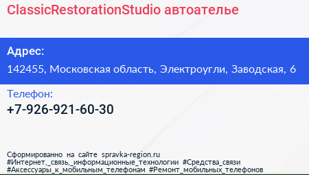 ClassicRestorationStudio, автоателье по адресу 142455, Московская область, Электроугли, Заводская, 6 в дальнейшем Организация, размещена в следующих категориях: