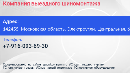 Компания выездного шиномонтажа по адресу 142455, Московская область, Электроугли, Центральная, 6 в дальнейшем Организация, размещена в следующих категориях:
