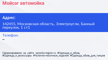 Мойcar, автомойка по адресу 142455, Московская область, Электроугли, Банный переулок, 1 ст1 в дальнейшем Организация, размещена в следующих категориях: