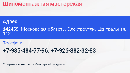 Шиномонтажная мастерская по адресу 142455, Московская область, Электроугли, Центральная, 112 в дальнейшем Организация, размещена в следующих категориях: